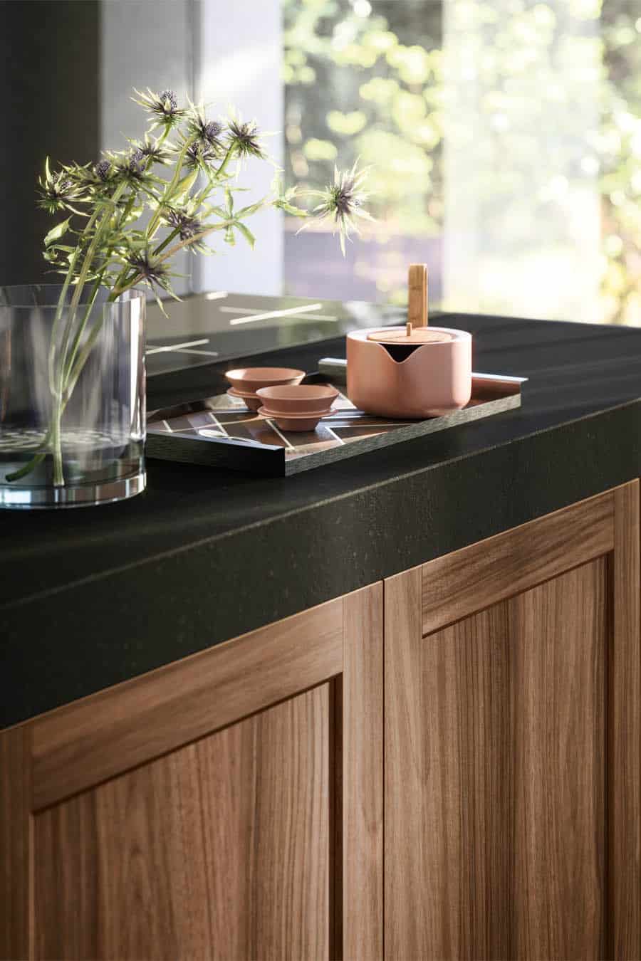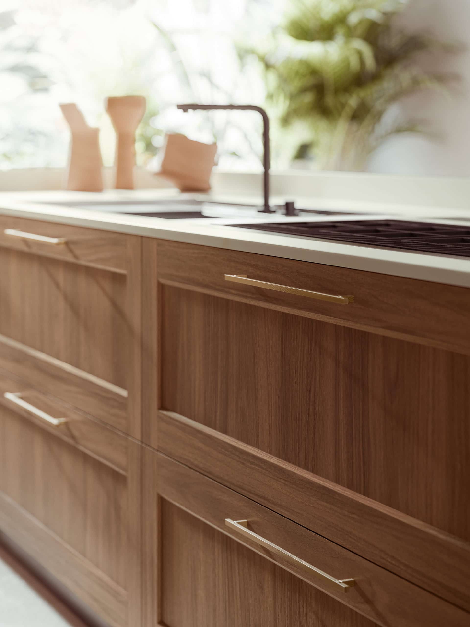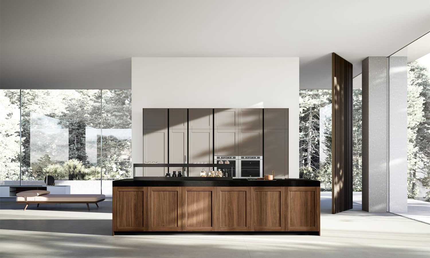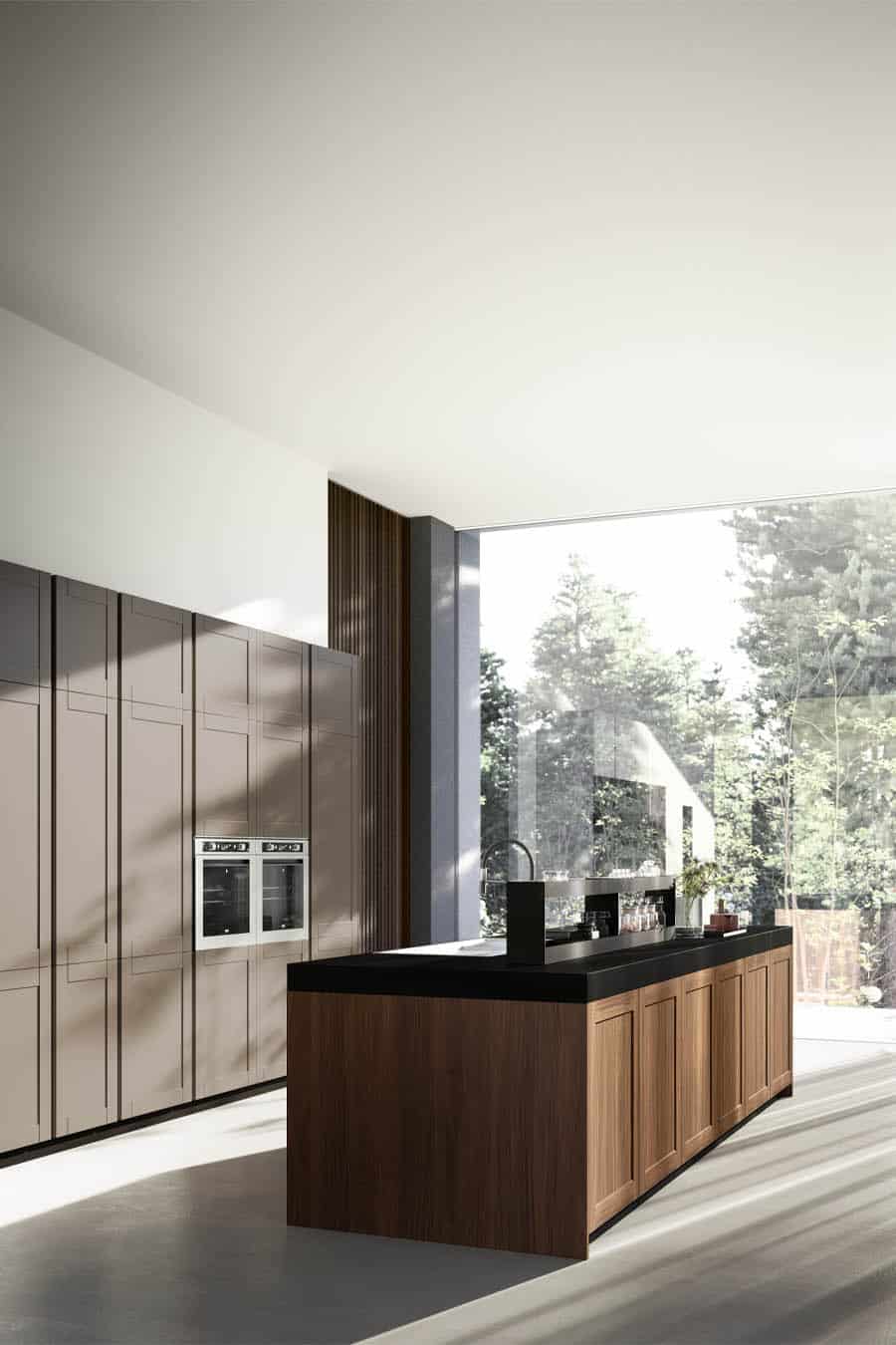 Les suggestions et les souvenirs accompagnent la pleine viabilité des espaces, interprétés par la porte à châssis en bois massif Noce dans l’îlot et la porte à châssis en mdf laqué mat Metro dans les colonnes. Le design rigoureux et essentiel est emphatisé par l’ouverture push-pull des portes et par le plan de travail en Silestone de grande épaisseur.