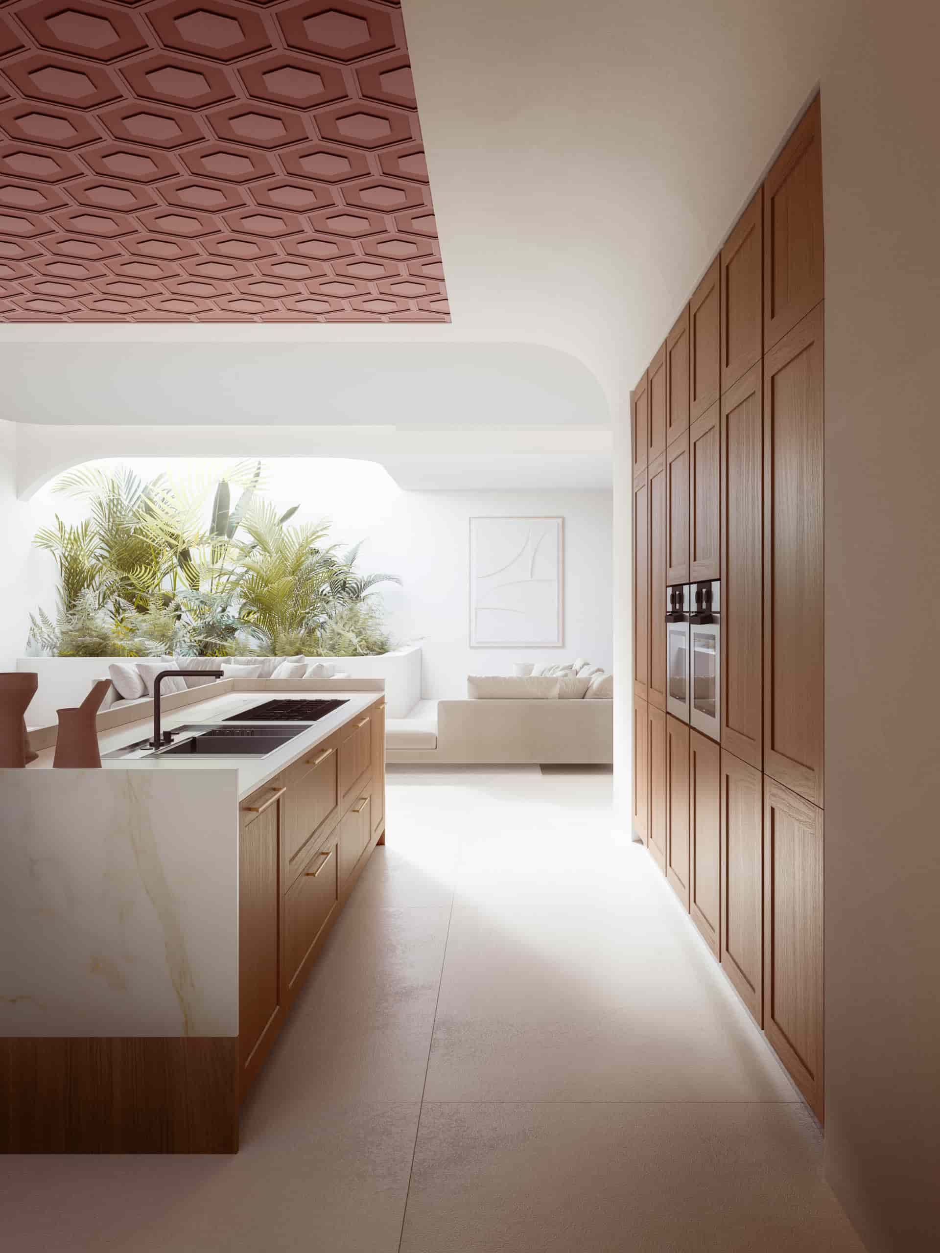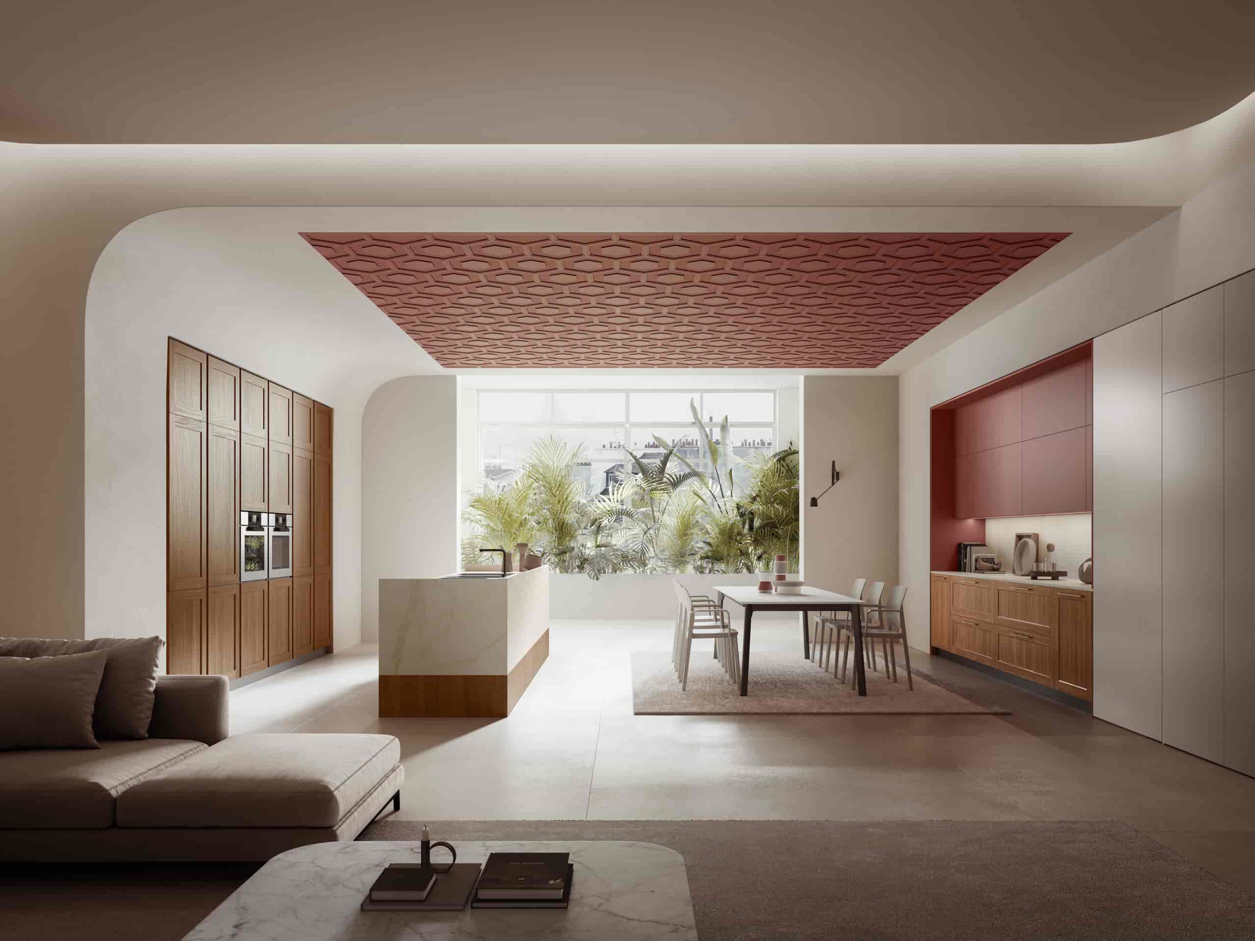 Ambiance moderne avec une touche classique mise en évidence par les formes arrondies qui servent d’encadrement à la cuisine avec porte cadre Ligna en bois massif de noyer avec poignées Gold. La zone jour combine le mélaminé Cachemire avec le Rosso Terra, repris également dans les détails architecturaux du plafond.
