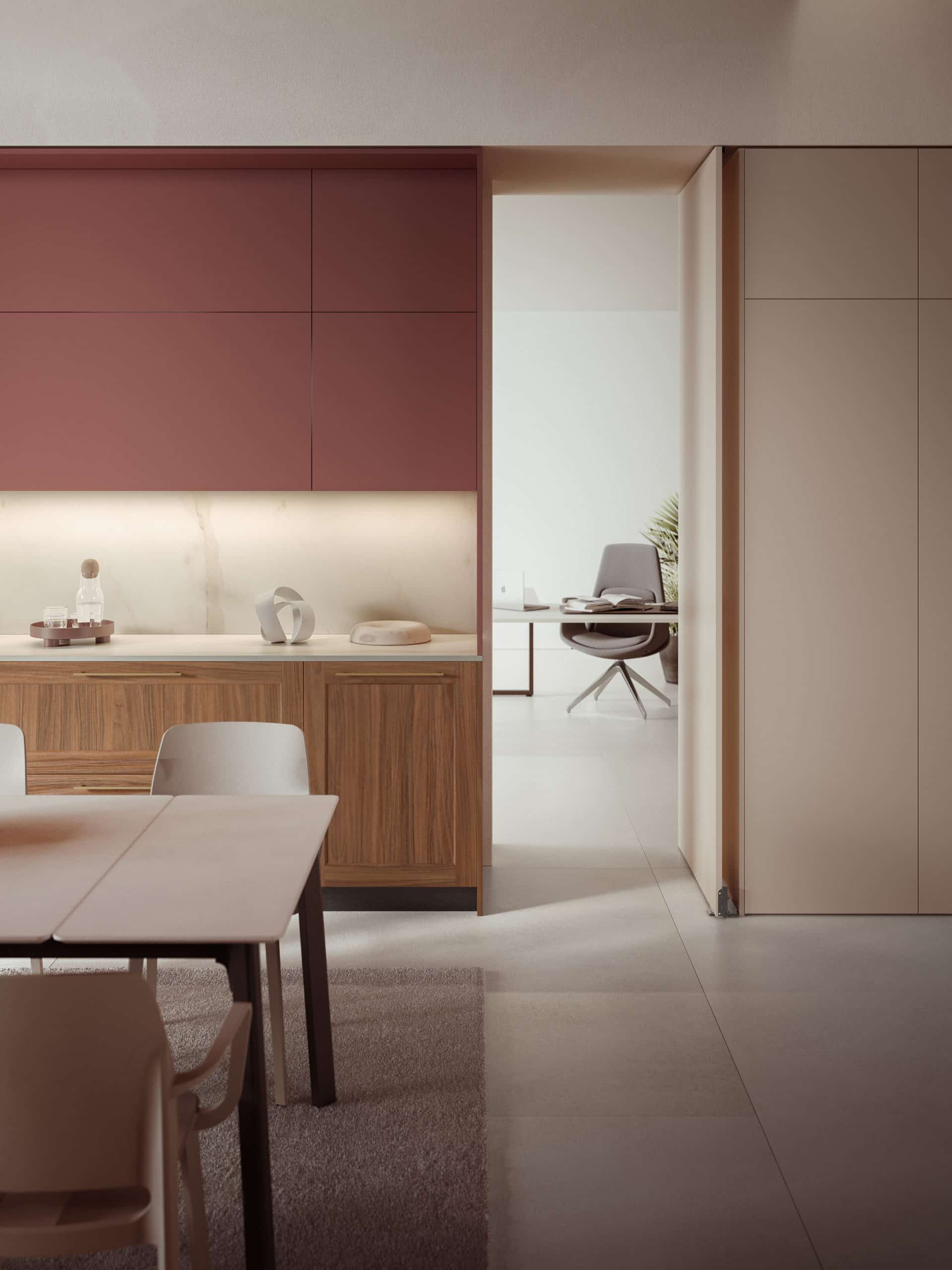 La porte à bascule intégrée dans les colonnes cache un passage vers d’autres ambiances. Symbiose parfaite entre fonctionnalité et design essentiel, elle est disponible aussi bien en version avec fixage sur colonne latérale qu’avec fixage sur colonne et élément sur colonne.