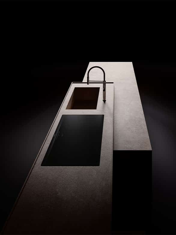 Des assemblages chromatiques et matériques sophistiqués sont le cœur de ce projet. Le laqué métallique Carbonio avec ses élégantes stries superficielles est assemblé à l’élégance du bois plaqué Olmo, complètement uni par les plans de travail façonnés et par les épaisseurs variables en céramique Inalco bicolore. Gorges en finition Titanio.