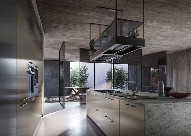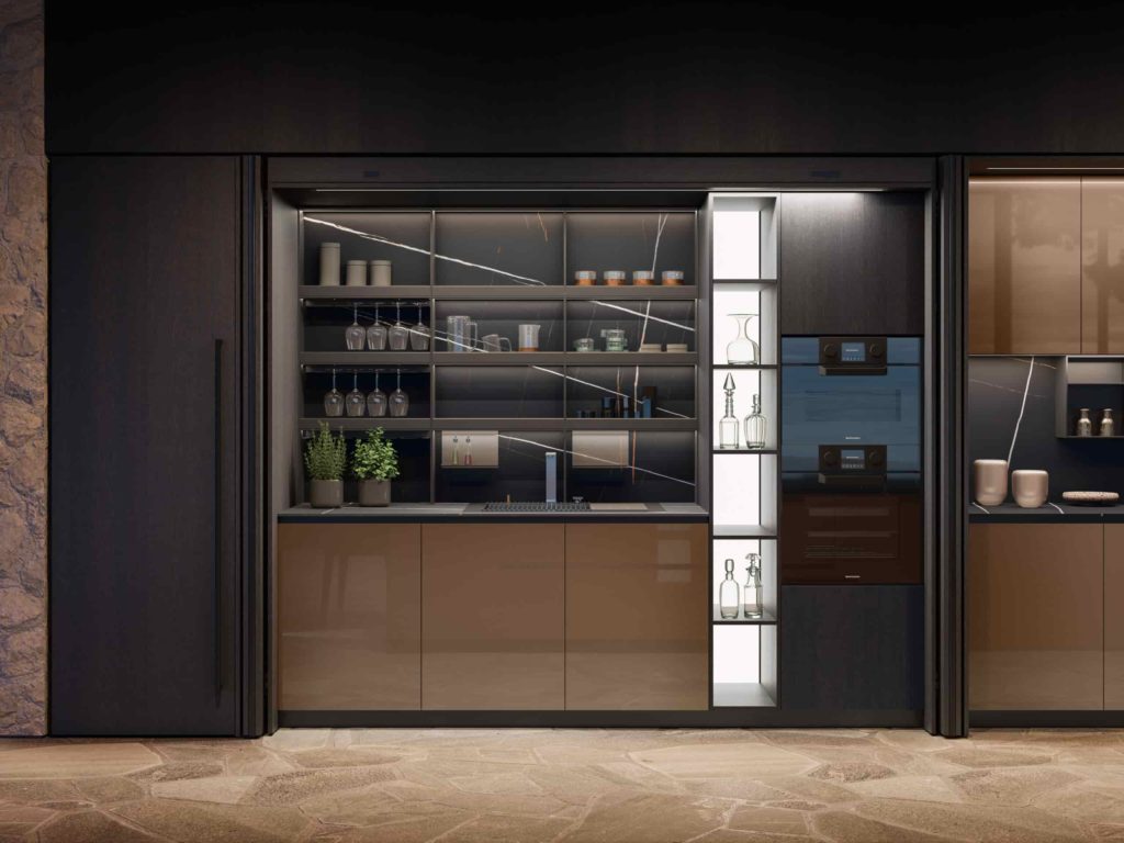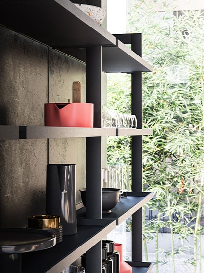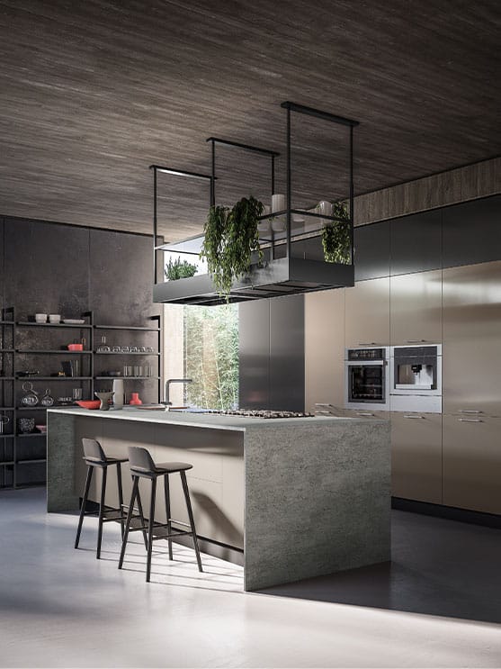 Une cuisine aux formes essentielles qui combine une configuration formelle rigoureuse. Les portes laquées micalisées Peltro et Ardesia représentent l’élément caractérisant de cette cuisine, en créant des reflets superficiels particuliers et très originaux.