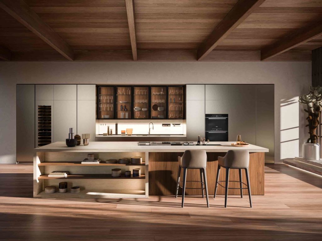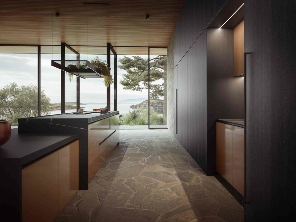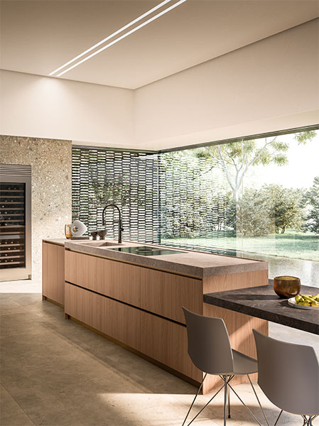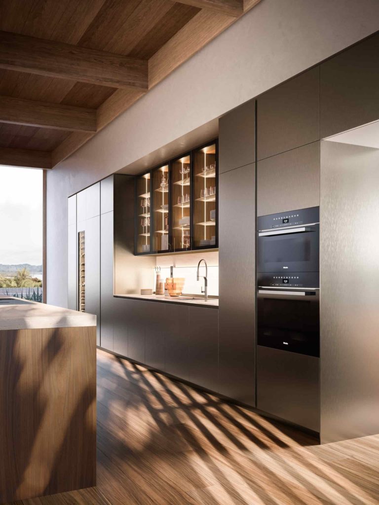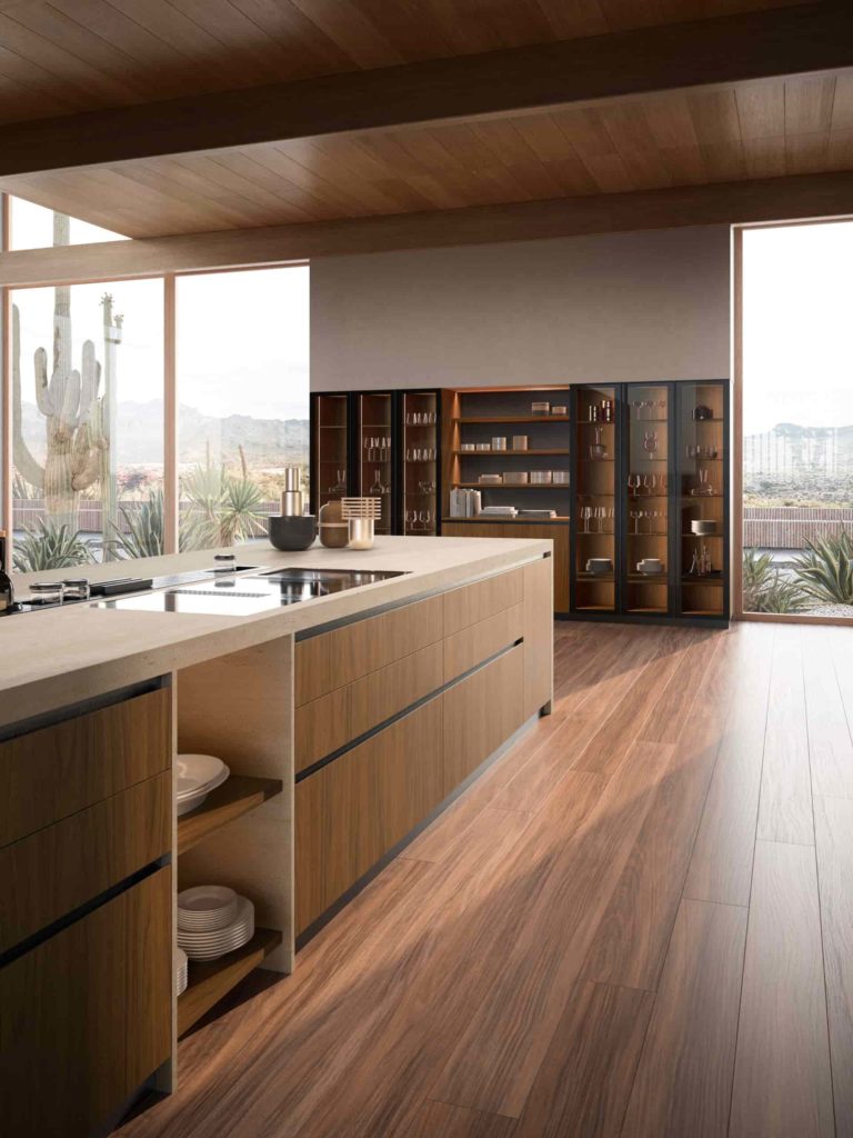Une cuisine qui communique avec l’ambiance extérieure, chaude, solaire. La présence du bois plaqué Noce et du laqué métallique Ambra, avec sa surface rayée et la poignée Zeta intégrée dans la porte, rend essentiel, fonctionnel et harmonieux le design de toute la composition.