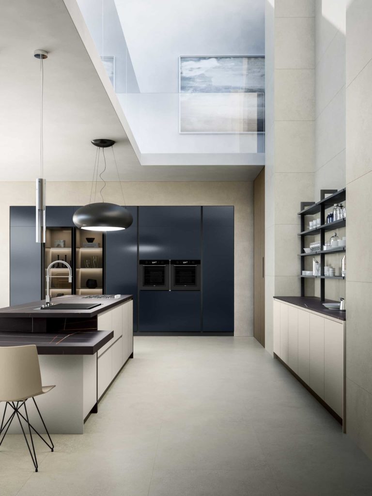 Le projet assemble des matériaux techniques comme l’aluminium et la céramique avec la vivacité des couleurs laquées micalisées à l’effet perlé particulier. Les portes en finition Talco ont une poignée Verso intégrée du même laquage micalisé et resplendissent dans une ambiance lumineuse qui contraste avec la couleur Blu Petrolio des colonnes et de la paroi équipée Palo en aluminium anodisé noir.