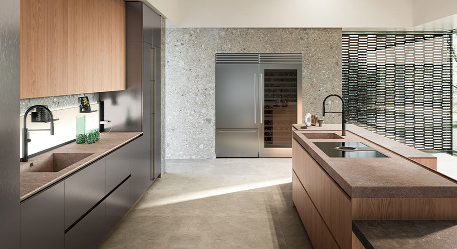 Des assemblages chromatiques et matériques sophistiqués sont le cœur de ce projet. Le laqué métallique Carbonio avec ses élégantes stries superficielles est assemblé à l’élégance du bois plaqué Olmo, complètement uni par les plans de travail façonnés et par les épaisseurs variables en céramique Inalco bicolore. Gorges en finition Titanio.